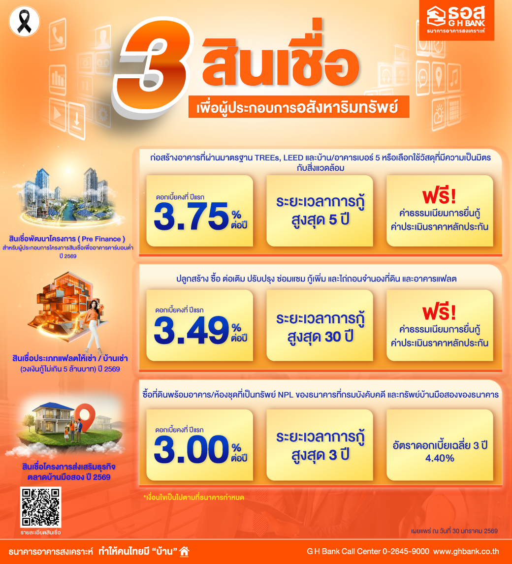 ธนาคารอาคารสงเคราะห์ (ธอส.) ร่วมขับเคลื่อนเศรษฐกิจผ่านภาคอสังหาริมทรัพย์และเพิ่มโอกาสให้คนไทยเข้าถึงที่อยู่อาศัยมากขึ้น จัดทำสินเชื่อเพื่อผู้ประกอบการ ปี 2569 ทั้งการพัฒนาโครงการใหม่ ต่อยอดธุรกิจเพื่อสร้างรายได้ และการพัฒนาโครงการที่เป็นมิตรต่อสิ่งแวดล้อม ในอัตราดอกเบี้ยพิเศษ ประกอบด้วย 1. สินเชื่อพัฒนาโครงการ (Pre Finance) สำหรับผู้ประกอบการโครงการสินเชื่อเพื่ออาคารคาร์บอนต่ำ 2. สินเชื่อประเภทแฟลตให้เช่า/บ้านเช่า (วงเงินกู้ไม่เกิน 5 ล้านบาท) ปี 2569 และ 3. สินเชื่อโครงการส่งเสริมธุรกิจตลาดบ้านมือสอง ปี 2569 ยื่นคำขอกู้และทำนิติกรรมได้ตั้งแต่วันนี้ถึงวันที่ 30 ธันวาคม 2569