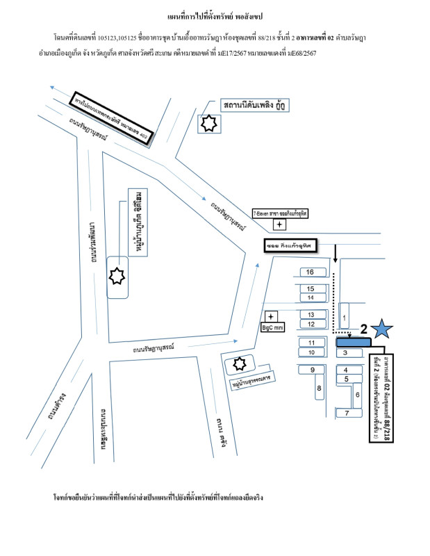 ศูนย์ข้อมูลฯ ได้ทำการตรวจสอบตำแหน่งที่ตั้งทรัพย์บนแผนที่ที่ปรากฎอยู่บนเว็บไซต์ โดยอาศัยข้อมูลจากแหล่งข้อมูลต่างๆ ที่เชื่อถือได้ เพื่อให้ตำแหน่งทรัพย์บนแผนที่ ใช้อ้างอิงท่านไปยังที่ตั้งของทรัพย์นั้นๆ โดยประมาณ ทั้งนี้ศูนย์ข้อมูลฯ ไม่สามารถยืนยันความถูกต้องของตำแหน่งทรัพย์ได้ ดังนั้น ทางศูนย์ข้อมูลฯ ขอสงวนสิทธิ์ไม่รับผิดชอบต่อข้อผิดพลาดทางตำแหน่งทรัพย์ที่เกิดขึ้นบนแผนที่ ผู้นำข้อมูลไปใช้พึงใช้วิจารณญาณและตรวจสอบตามความเหมาะสม