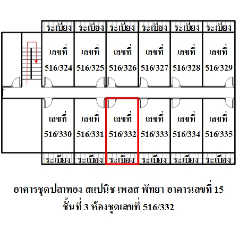 ห้องชุดพักอาศัย เลขที่ 516/332 ชั้นที่ 3 อาคารเลขที่ 15 ชื่ออาคารชุด ปลาทอง สแปนิช เพลส พัทยา ทะเบียนอาคารชุดเลขที่ 11/2535อัตราส่วนแห่งกรรมสิทธิ์ในทรัพย์ส่วนกลาง : 419 ส่วน ใน 26,540 ส่วนข้อมูลอาคารชุด : อาคารสูง 5 ชั้น มีจำนวนห้องชุดประมาณ 30 ห้อง/อาคาร โดยโครงการฯ มีทั้งหมด 10 อาคารข้อมูล ณ วันที่ 21 ก.พ. 68 ค่าส่วนกลางประมาณ 500.00 บาท/เดือน