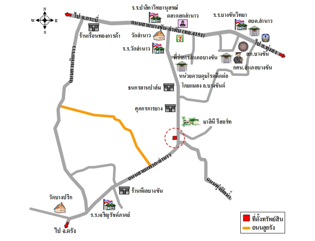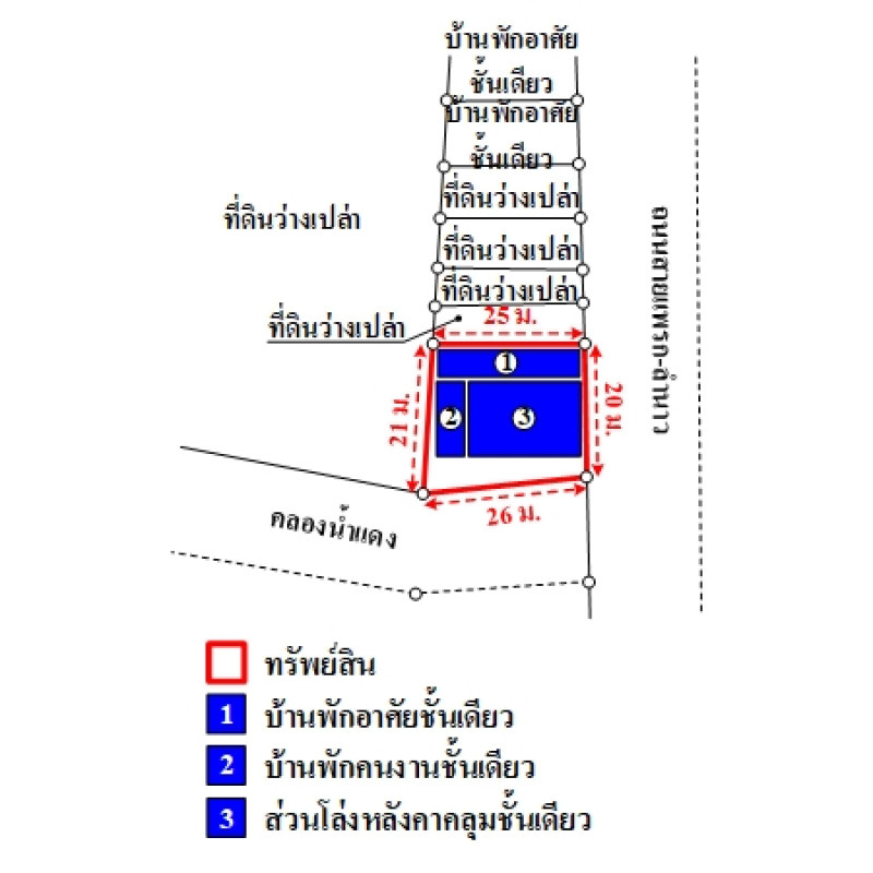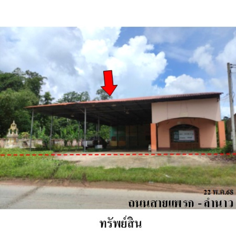 ที่ดินเป็นรูปคล้ายสี่เหลี่ยมผืนผ้า ขนาดแปลงที่ดินด้านทิศตะวันออกติดถนน กว้างประมาณ 20 ม. ลึกสุดติดคลองน้ำแดง ประมาณ 26 ม.บสส. รับโอนกรรมสิทธิ์สิ่งปลูกสร้าง ประกอบด้วย1. บ้านพักอาศัยตึกชั้นเดียว เลขที่ 146 2. บ้านพักคนงาน ไม่มีเลขที่3. โกดังเก็บของ ไม่มีเลขที่ (ข้อมูลจากการสำรวจสภาพทรัพย์สินระบุสิ่งปลูกสร้างมีลักษณะเป็นส่วนโล่งหลังคาคลุมชั้นเดียว)ถนนผ่านหน้าทรัพย์สิน ได้แก่ ถนนสายแพรก-ลำนาว เป็นทางสาธารณประโยชน์ ผิวจราจรลาดยาง กว้างประมาณ 6 ม. เขตทางกว้างประมาณ 30 ม.