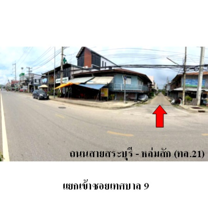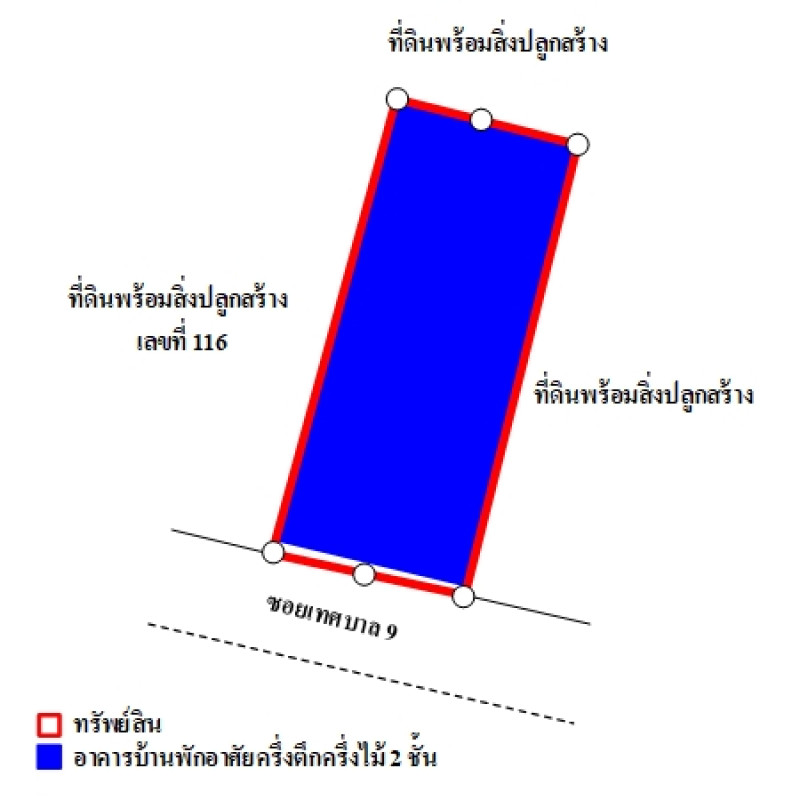 ที่ดินจำนวน 2 แปลงติดต่อกัน เป็นรูปสี่เหลี่ยมผืนผ้า ขนาดแปลงที่ดินด้านทิศใต้ติดถนน กว้างประมาณ 9 ม. ลึกประมาณ 20.5 ม.บสส. รับโอนกรรมสิทธิ์สิ่งปลูกสร้าง ประกอบด้วย1. บ้านพักอาศัยครึ่งตึกครึ่งไม้สองชั้น เลขที่ 114/12. ห้องแถวไม้ชั้นเดียว ไม่มีเลขที่ถนนผ่านหน้าทรัพย์สิน ได้แก่ ซอยเทศบาล 9 เป็นทางสาธารณประโยชน์ ผิวจราจรคอนกรีต กว้างประมาณ 4 ม. เขตทางกว้างประมาณ 6 ม.