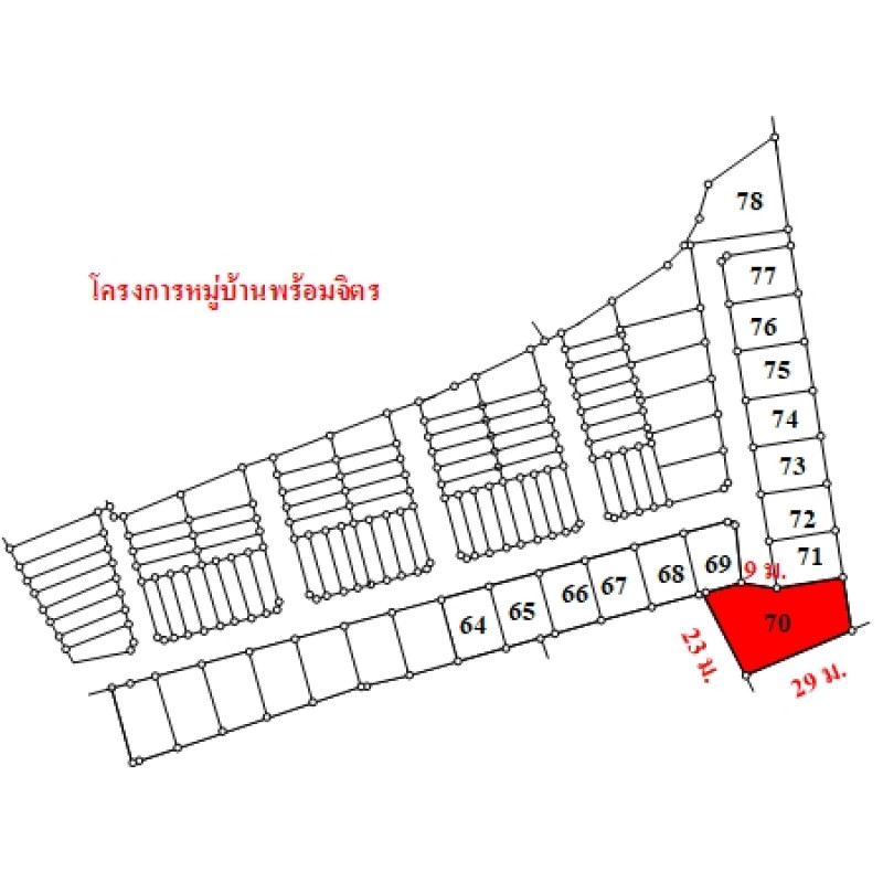ที่ดินเป็นรูปหลายเหลี่ยม ขนาดแปลงที่ดินด้านทิศเหนือ กว้างประมาณ 9 ม.(บางส่วนติดถนน) ลึกสุดประมาณ 23 ม. ระดับที่ดินสูงกว่าถนนผ่านหน้าประมาณ 0.2 ม.ถนนผ่านหน้าทรัพย์สิน ได้แก่ ถนนภายในโครงการหมู่บ้านพร้อมจิตร เป็นทางในโครงการจัดสรรที่ได้รับอนุญาตแล้ว ผิวจราจรคอนกรีต กว้างประมาณ 6-12 ม. เขตทางกว้างประมาณ 8-14 ม.