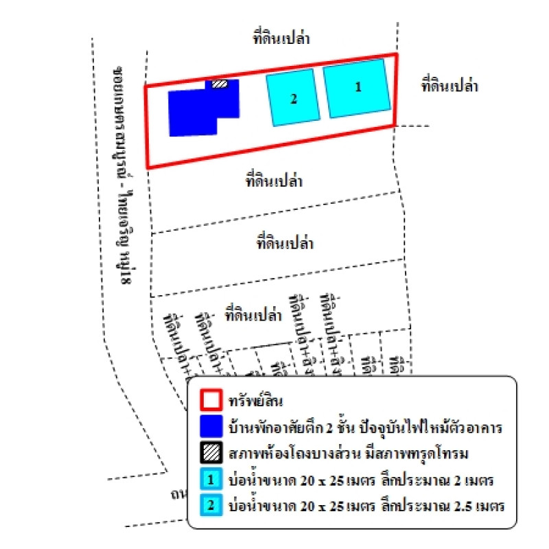ที่ดินเป็นรูปคล้ายสี่เหลี่ยมผืนผ้า ขนาดแปลงที่ดินด้านทิศตะวันตกติดถนน กว้างประมาณ 34 ม. ลึกสุดประมาณ 112 ม.ภายในที่ดินมีบ่อน้ำ จำนวน 2 บ่อ ได้แก่ - บ่อที่ 1 ขนาดประมาณ 20x25 ม. เฉลี่ยลึกประมาณ 2 ม.- บ่อที่ 2 ขนาดประมาณ 20x20 ม. เฉลี่ยลึกประมาณ 2.5 ม.ถนนผ่านหน้าทรัพย์สิน ได้แก่ ซอยเกษตรสมบูรณ์-บ้านไทยเจริญ หมู่ 18 เป็นทางสาธารณประโยชน์ ผิวจราจรลาดยาง กว้างประมาณ 5 ม. เขตทางกว้างประมาณ 8 ม.