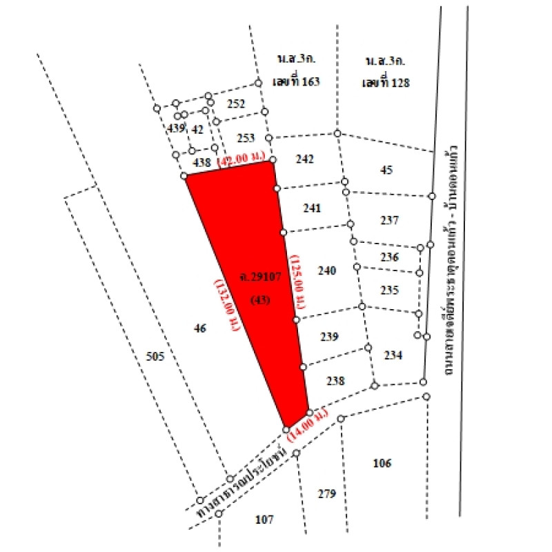 ที่ดินเป็นรูปหลายเหลี่ยม ขนาดแปลงที่ดินด้านทิศใต้ติดถนน กว้างประมาณ 14 ม. ลึกสุดประมาณ 132 ม. ระดับที่ดินต่ำกว่าถนนประมาณ 1 ม.ถนนผ่านหน้าทรัพย์สิน เป็นทางสาธารณประโยชน์ ผิวจราจรคอนกรีต กว้างประมาณ 5 ม. เขตทางกว้างประมาณ 6 ม.