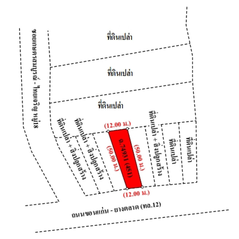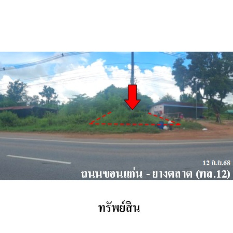ที่ดินเป็นรูปคล้ายสี่เหลี่ยมผืนผ้า ขนาดแปลงที่ดินด้านทิศใต้ติดถนน กว้างประมาณ 12 ม. ลึกประมาณ 50 ม.ถนนผ่านหน้าทรัพย์สิน ได้แก่ ถนนสายขอนแก่น-ยางตลาด (ทล.12) เป็นทางสาธารณประโยชน์ ผิวจราจรลาดยาง กว้างประมาณ 14 ม. เขตทางกว้างประมาณ 50 ม.
