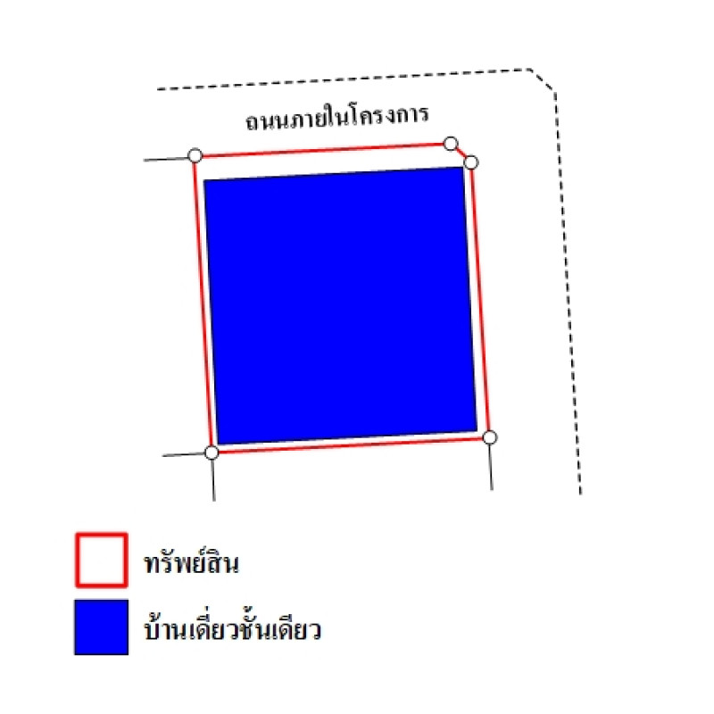 ที่ดินเป็นรูปสี่เหลี่ยมผืนผ้า ตั้งอยู่ติดถนน 2 ด้าน ขนาดแปลงที่ดินด้านทิศเหนือ กว้างประมาณ 14 ม. และด้านทิศตะวันออก กว้างประมาณ 15 ม. ลึกสุดประมาณ 16 ม.บสส. รับโอนกรรมสิทธิ์สิ่งปลูกสร้างระบุเป็นบ้านพักอาศัยตึกชั้นเดียว เลขที่ 71/63 (หลังมุม)ถนนผ่านหน้าทรัพย์สิน ได้แก่ ถนนภายในโครงการฯ เป็นทางในโครงการจัดสรรที่ได้รับอนุญาตแล้ว ผิวจราจรคอนกรีต กว้างประมาณ 6 ม. เขตทางกว้างประมาณ 8 ม.