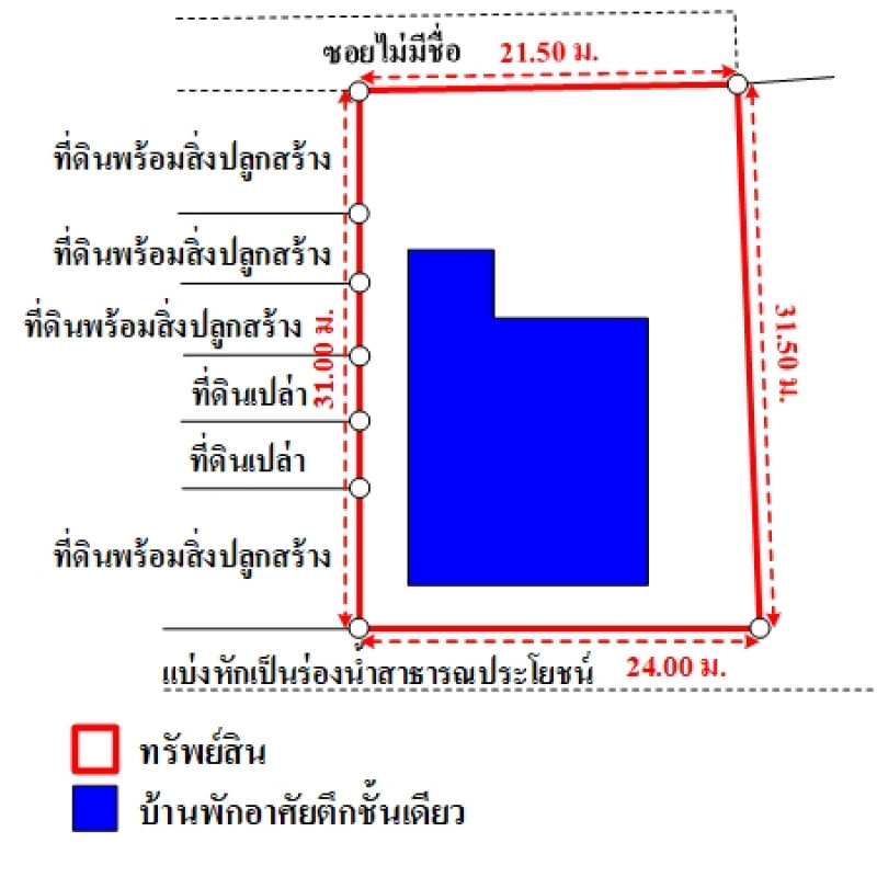 ที่ดินเป็นรูปคล้ายสี่เหลี่ยมผืนผ้า ขนาดแปลงที่ดินด้านทิศเหนือติดถนน กว้างประมาณ 21.5 ม. ลึกสุดประมาณ 31.5 ม.บสส.รับโอนกรรมสิทธิ์สิ่งปลูกสร้าง ระบุเป็น บ้านพักอาศัยตึกชั้นเดียว เลขที่ 12ถนนผ่านหน้าทรัพย์สิน เป็นทางสาธาณประโยชน์ ผิวจราจรลูกรัง กว้างประมาณ 3 ม. เขตทางกว้างประมาณ 4 ม.