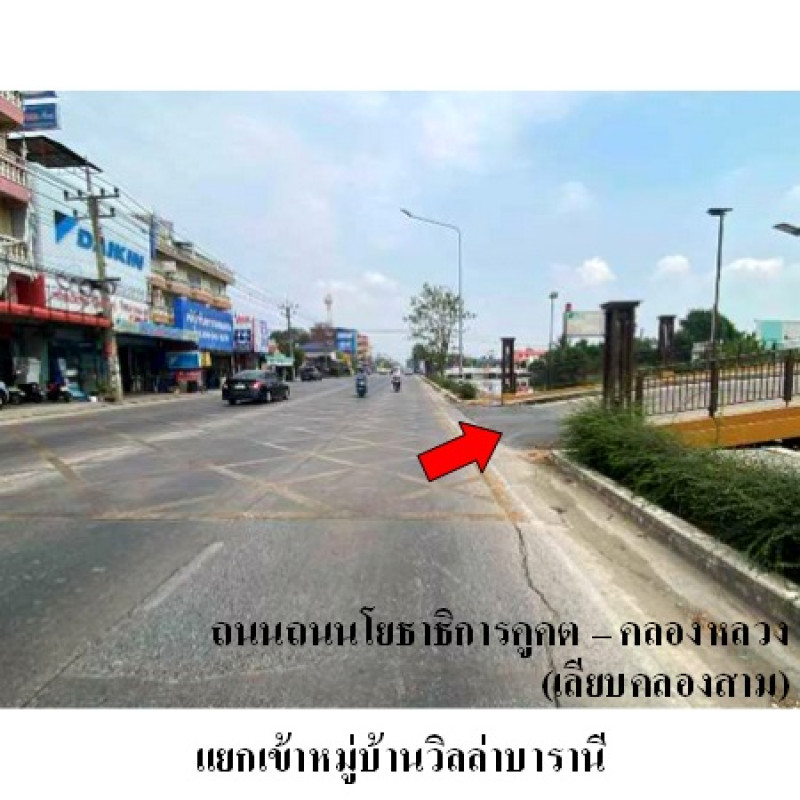 ที่ดินเป็นรูปสี่เหลี่ยมผืนผ้า ขนาดแปลงที่ดินด้านทิศเหนือติดถนน กว้างประมาณ 14 ม. ลึกประมาณ 14.71 ม.บสส. รับโอนกรรมสิทธิ์สิ่งปลูกสร้างระบุเป็นบ้านพักอาศัยตึกสองชั้น เลขที่ 99/200ถนนผ่านหน้าทรัพย์สิน ได้แก่ ถนนภายในหมู่บ้านวิลล่าบารานี เป็นทางในโครงการจัดสรรที่ได้รับอนุญาตแล้ว ผิวจราจรคอนกรีต กว้างประมาณ 12 เขตทางกว้างประมาณ 14 ม.