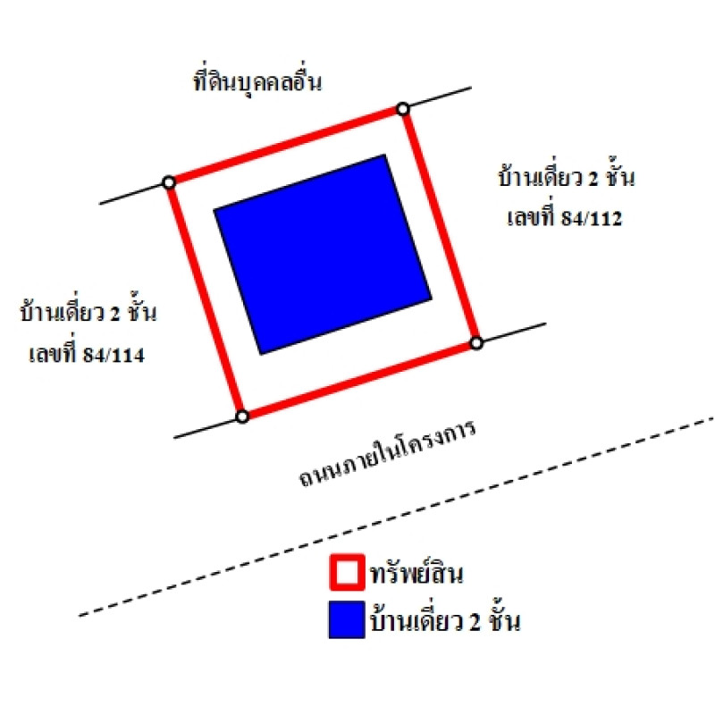 ที่ดินเป็นรูปสี่เหลี่ยมจัตุรัส ขนาดแปลงที่ดินด้านทิศใต้ติดถนน กว้างประมาณ 16 ม. ลึกประมาณ 16 ม.บสส. รับโอนกรรมสิทธิ์สิ่งปลูกสร้างระบุเป็นบ้านพักอาศัย 2 ชั้น เลขที่ 84/113ถนนผ่านหน้าทรัพย์สิน ได้แก่ ถนนภายในโครงการฯ เป็นทางในโครงการจัดสรรที่ได้รับอนุญาตแล้ว ผิวจราจรคอนกรีต กว้างประมาณ 6 ม. เขตทางกว้างประมาณ 8 ม.