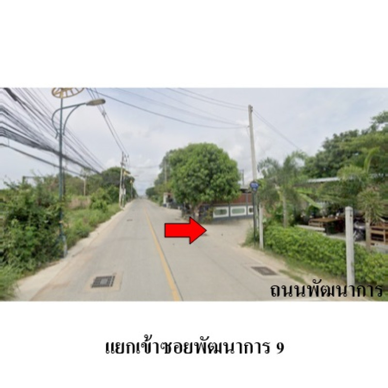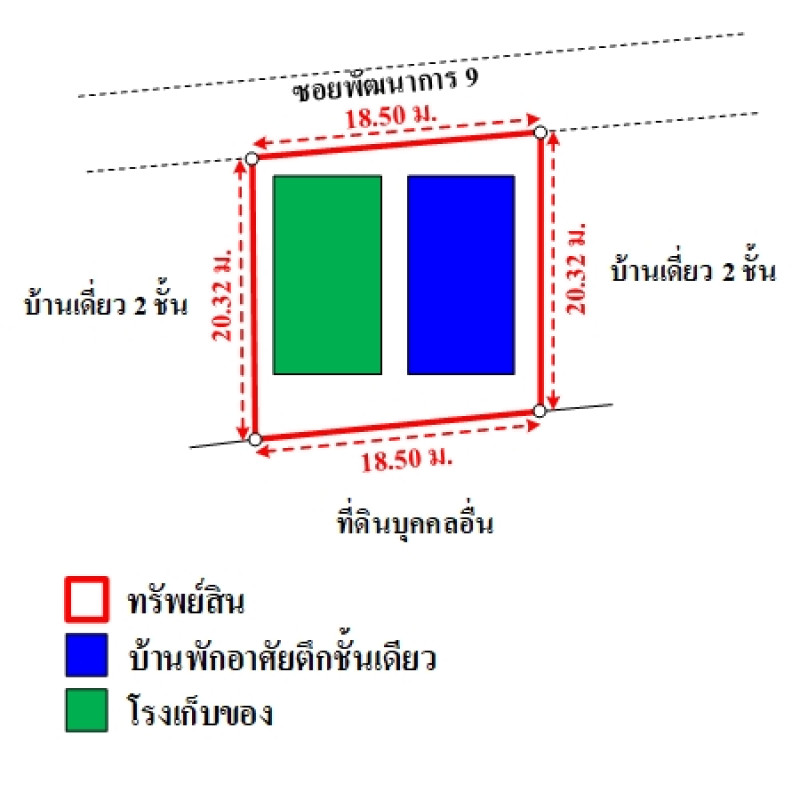 ที่ดินเป็นรูปสี่เหลี่ยมผืนผ้า ขนาดแปลงที่ดินด้านทิศเหนือติดถนน กว้างประมาณ 18.5 ม. ลึกประมาณ 20.32 ม.บสส. รับโอนกรรมสิทธิ์สิ่งปลูกสร้างระบุเป็นบ้านพักอาศัยตึกชั้นเดียว เลขที่ 43/37, โรงเก็บของถนนผ่านหน้าทรัพย์สิน ได้แก่ ซอยพัฒนาการ 9 เป็นทางสาธารณประโยชน์ ผิวจราจรคอนกรีต กว้างประมาณ 5 ม. เขตทางกว้างประมาณ 5 ม.