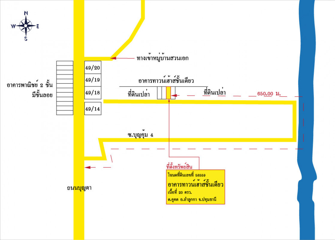 ทาวน์เฮ้าส์ชั้นเดียว มี 1 ห้องโถง 1 ห้องนอน 1 ห้องน้ำ พื้นที่ใช้สอยประมาณ 38.35 ตารางเมตร ด้านหน้าที่ดินติดถนนเข้า-ออกกว้างประมาณ 4.80 เมตร ลึกประมาณ 16.65 เมตร ขนาดอาคารกว้างประมาณ 3.80 เมตร ลึกประมาณ 9.50 เมตร