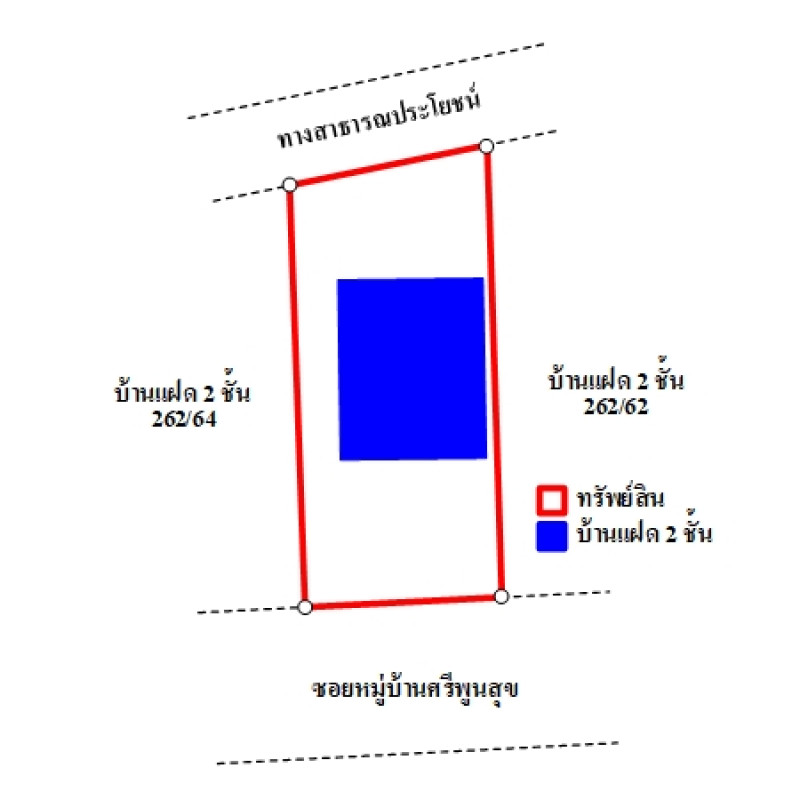 ที่ดินเป็นรูปสี่เหลี่ยมผืนผ้า ขนาดแปลงที่ดินด้านทิศใต้ด้านทิศเหนือ กว้างประมาณ 9 ม. ลึกสุดประมาณ 20.5 ม.บสส. รับโอนกรรมสิทธิ์สิ่งปลูกสร้างระบุเป็นบ้านพักอาศัยแฝดตึกสองชั้น เลขที่ 262/63 และโรงจอดรถ ถนนผ่านหน้าทรัพย์สิน ได้แก่ ซอยหมู่บ้านศรีพูนสุข เป็นทางในโครงการจัดสรรที่ได้รับอนุญาตแล้ว ผิวจราจรคอนกรีต กว้างประมาณ 6 ม. เขตทางกว้างประมาณ 8 ม.