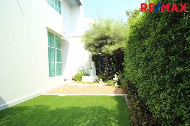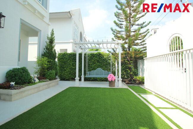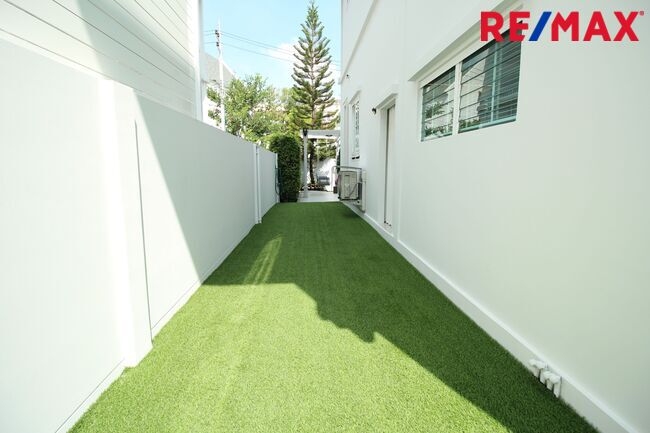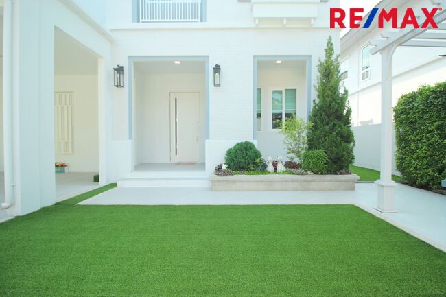3.พื้นที่รอบบ้าน : จัดสวนสไตล์อังกฤษ ปูหญ้าเทียมและหินกรวด ดูแลง่าย