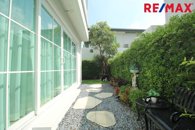 4.Private Courtyard : พื้นที่ Semi-Outdoor Space พื้นที่พักผ่อน อ่านหนังสือ จิบกาแฟ กลางบ้าน Semi Outdoor (อยู่ในโครงสร้างมีหลังคาคลุม) เชื่อมต่อสวนสวยหลังบ้าน Private Courtyard ได้ความเป็นส่วนตัวท่ามกลางธรรมชาติ ปัจจุบันตกแต่งสวนสไตล์อังกฤษ ดูแลง่าย เดินสะดวก อนาคตหากต้องการห้องเพิ่ม สามารถกั้นด้วยบานกระจกฝั่งเดียวก็จะได้ห้องทำงาน หรือ ห้องนอนเล็กชั้น 1 วิวสวนได้ด้วย