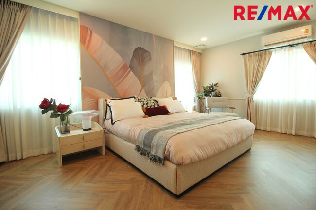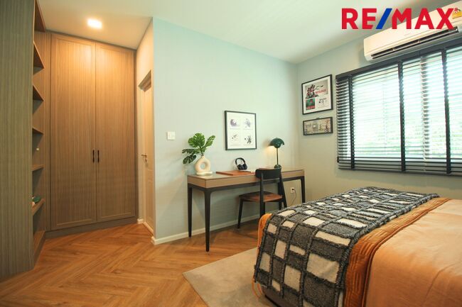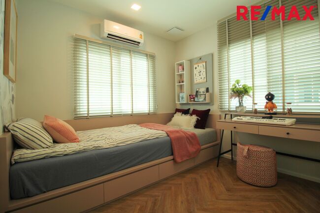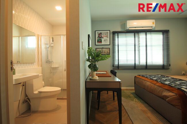 - Master bedroom อยู่ห้องด้านหน้าบ้าน มี Walk-in closet พื้นที่นั่งเล่นก่อนนอน และ โต๊ะเครื่องแป้ง (โต๊ะทำงาน) ตกแต่งพร้อมใช้ เตียงนอน ฟูก และกรุผนังแบบ Minimal พร้อมห้องน้ำในตัว ที่มีโถสุขภัณฑ์อัปเกรดให้เป็นรุ่น Auto Washlet ฝารองนั่งอัตโนมัติ