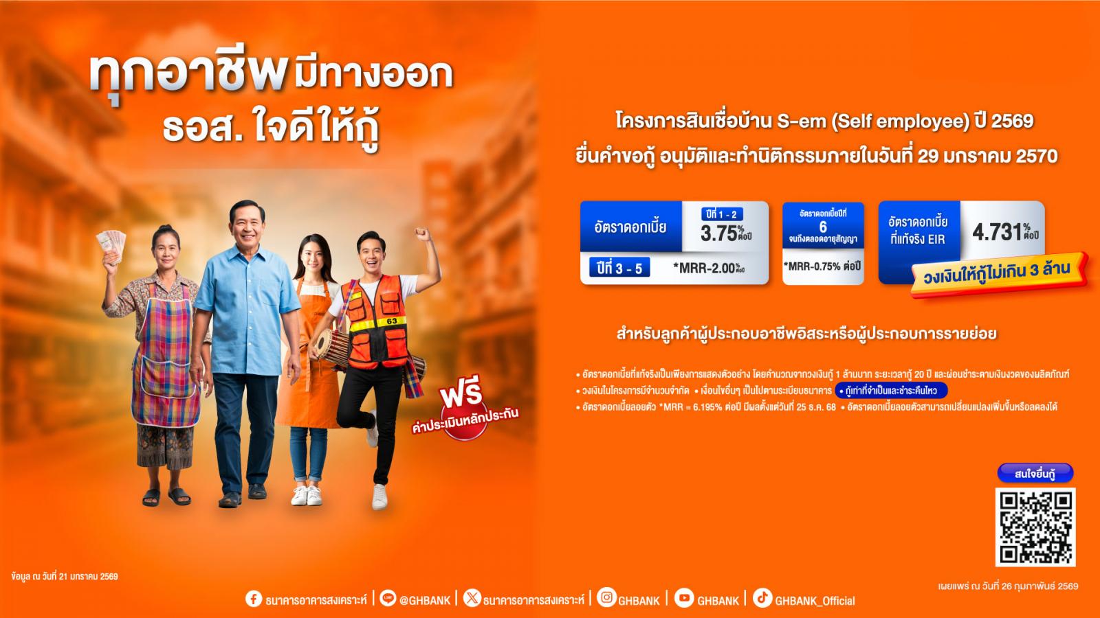 ธนาคารอาคารสงเคราะห์ (ธอส.) จัดสรรวงเงิน 5,000 ล้านบาท สนับสนุนผู้ประกอบอาชีพอิสระหรือผู้ประกอบการรายย่อย อาทิ ค้าขาย คนขับแท็กซี่ ฟรีแลนซ์ หรือผู้รับจ้างทั่วไป ที่ปัจจุบันไม่มีประวัติการผ่อนชำระสินเชื่อที่อยู่อาศัยกับ ธอส. ให้มีบ้านในฝันเป็นของตนเองได้ง่าย ๆ กับ “โครงการสินเชื่อบ้าน S-em (Self Employee) ปี 2569” สำหรับกู้เพื่อซื้อ ปลูกสร้าง ไถ่ถอนจำนองจากสถาบันการเงินอื่น หรือชำระหนี้พร้อมไถ่ถอนจำนอง โดยให้วงเงินกู้สูงสุดไม่เกิน 3 ล้านบาทต่อรายต่อหลักประกัน อัตราดอกเบี้ย ปีที่ 1 – 2 เพียง 3.75% ต่อปี ปีที่ 3 – 5 เท่ากับ MRR-2.00% ต่อปี ปีที่ 6 จนถึงตลอดอายุสัญญา เท่ากับ MRR-0.75% ต่อปี ผ่อนชำระเงินงวดเริ่มต้นเพียงล้านละ 4,200 บาท พิเศษ ฟรี!! ค่าประเมินราคาหลักประกันมูลค่า 1,900 – 2,800 บาท ทั้งนี้ สินเชื่อบ้าน S-em เป็นอีกหนึ่งผลิตภัณฑ์ที่สะท้อนบทบาท ธอส. สู่ Beyond Housing Bank : มากกว่าการปล่อยกู้ คือเพื่อนคู่คิดเรื่องบ้าน ที่อยู่เคียงข้างกันตั้งแต่วันแรกของการมีบ้าน ดูแลลูกค้าและเติบโตไปด้วยกัน ผู้ที่สนใจยื่นขอสินเชื่อได้ตั้งแต่วันนี้ อนุมัติและทำนิติกรรมภายในวันที่ 29 มกราคม 2570 สอบถามรายละเอียดเพิ่มเติมได้ที่ G H Bank Call Center โทร.0-2645-9000 หรือ Facebook Fanpage ธนาคารอาคารสงเคราะห์ และติดตามข่าวสารของธนาคารได้ที่ G H Bank Social Media ทุกช่องทาง