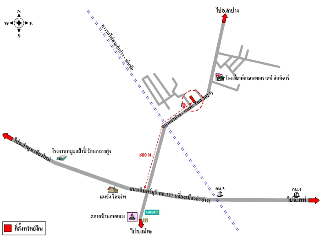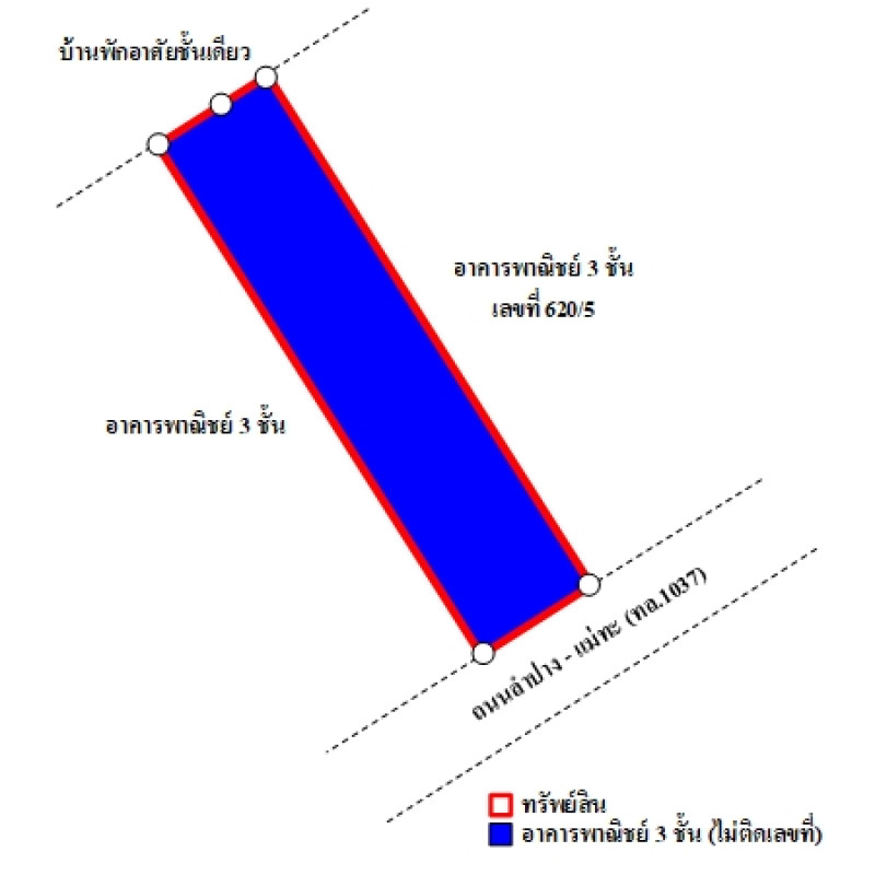 ที่ดินจำนวน 2 แปลงติดต่อกัน เป็นรูปสี่เหลี่ยมผืนผ้า ขนาดแปลงที่ดินด้านทิศใต้ติดถนน กว้างประมาณ 4 ม. ลึกประมาณ 19.4 ม.บสส. รับโอนกรรมสิทธิ์สิ่งปลูกสร้างระบุเป็นตึกแถว 3 ชั้น เลขที่ 620/4 (ข้อมูลจากการสำรวจสภาพทรัพย์สินไม่ติดเลขที่)ถนนผ่านหน้าทรัพย์สิน ได้แก่ ถนนลำปาง-แม่ทะ (ทล.1037) เป็นทางสาธารณประโยชน์ ผิวจราจรลาดยาง กว้างประมาณ 12 ม. เขตทางกว้างประมาณ 20 ม.