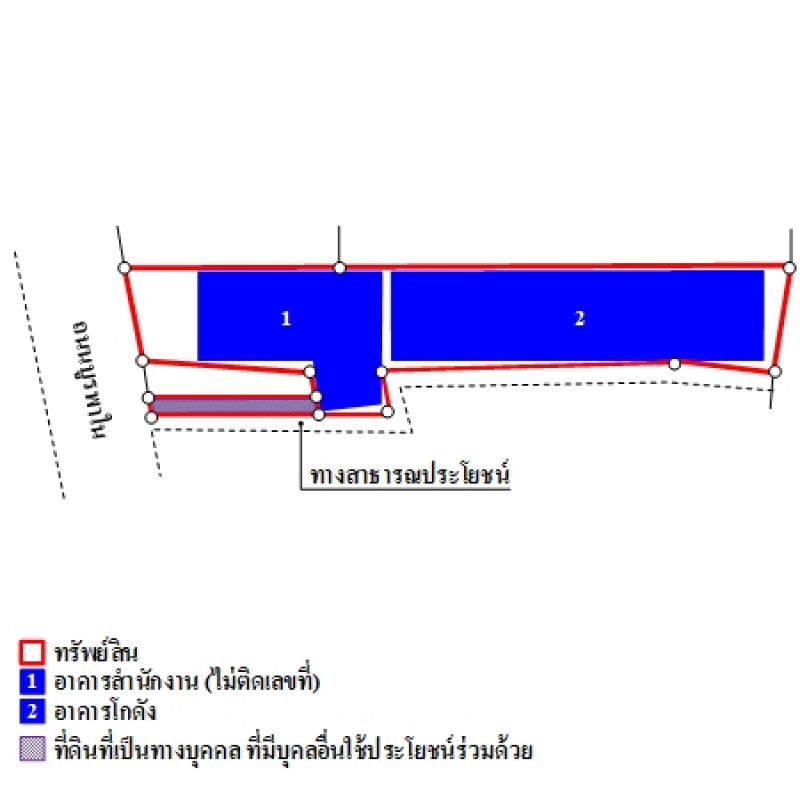 ที่ดินจำนวน 2 แปลงติดต่อกัน เป็นรูปหลายเหลี่ยม ตั้งอยู่ติดถนน 2 ด้าน ขนาดแปลงที่ดินด้านทิศตะวันตกติดถนนบูรพาใน กว้างประมาณ 15 ม. และด้านทิศใต้ติดถนน ลึกสุดประมาณ 82 ม. - โฉนดที่ดินเลขที่ 19871 ที่ดินบางส่วนขนาดประมาณ 2x20 ม. คิดเป็นเนื้อที่ประมาณ 10 ตร.ว. มีสภาพเป็นทาง มีผู้ใช้ประโยชน์ร่วมกัน (ดูผังที่ดินประกอบ)บสส. รับโอนกรรมสิทธิ์สิ่งปลูกสร้างระบุเป็นอาคารสำนักงาน 4 ชั้น ไม่ปรากฏเลขที่ และโกดัง ไม่ปรากฏเลขที่ ถนนผ่านหน้าทรัพย์สิน ได้แก่ ถนนบูรพาใน เป็นทางสาธารณประโยชน์ ผิวจราจรคอนกรีต กว้างประมาณ 12 ม. เขตทางกว้างประมาณ 16 ม.