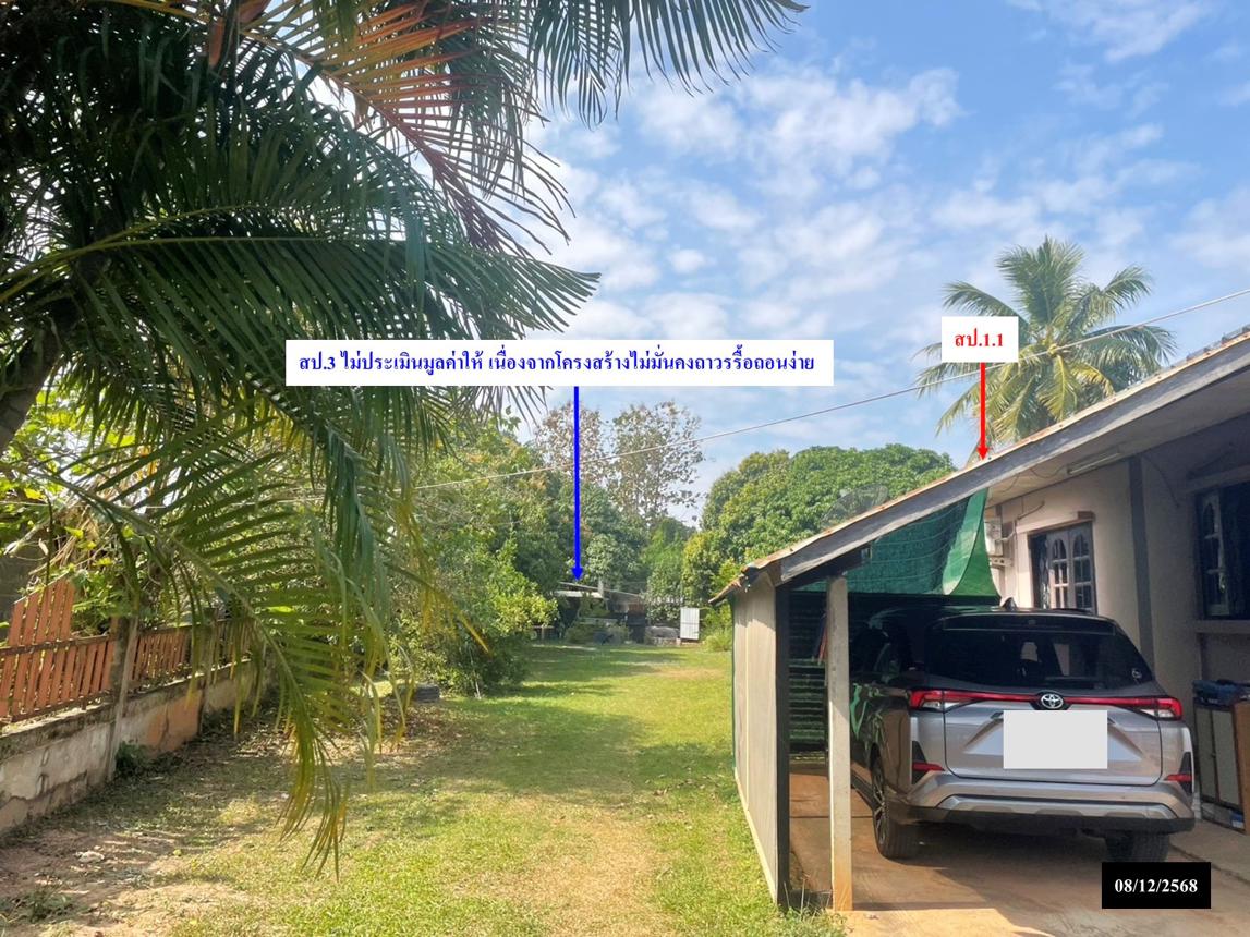 - บ้านพักอาศัยชั้นเดียว อายุอาคาร 18 ปี พื้นที่ใช้สอย 234 ตร.ม. 3 ห้องนอน 2 ห้องน้ำ - ส่วนโล่งหลังคาคลุม อายุอาคาร 13 ปี พื้นที่ใช้สอย 10.50 ตร.ม. **สิ่งปลูกสร้างบางส่วนไม่ประเมินมูลค่า ขอให้ผู้ซื้อตรวจสอบข้อมูล และสภาพทรัพย์ก่อนการเสนอซื้อ**