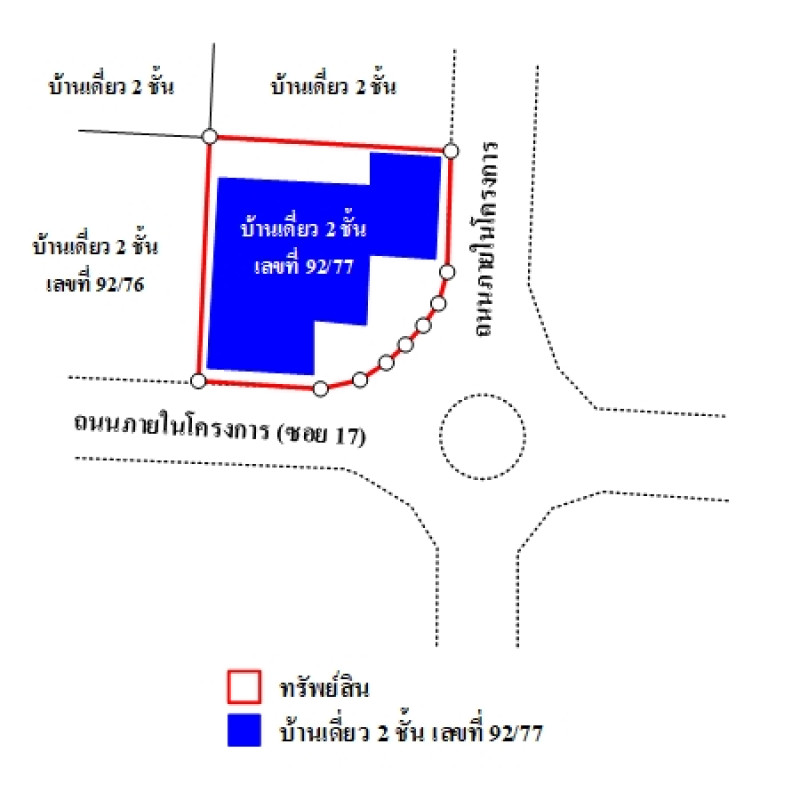 ที่ดินเป็นรูปหลายหลี่ยม ตั้งอยู่ติดถนน 2 ด้าน ขนาดแปลงที่ดินด้านทิศใต้ กว้างประมาณ 11.5 ม. และด้านทิศตะวันตก กว้างประมาณ 18.5 ม.บสส. รับโอนกรรมสิทธิ์สิ่งปลูกสร้างระบุเป็นบ้านพักอาศัยตึก 2 ชั้น เลขที่ 92/77 พร้อมรั้วเหล็กดัดถนนผ่านหน้าทรัพย์สิน ได้แก่ ถนนภายในโครงการฯ (ถนนเมน) เป็นทางในโครงการจัดสรรที่ได้รับอนุญาตแล้ว ผิวจราจรคอนกรีต กว้างประมาณ 6 ม. เขตทางกว้างประมาณ 8 ม.ข้อมูลค่าส่วนกลาง ณ วันที่ 7 พ.ค. 67 ประมาณ 19,264.80 บาท / ปี