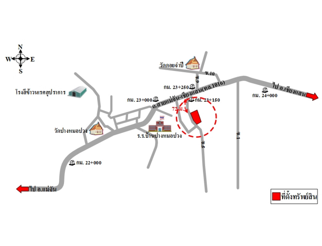 ที่ดินจำนวน 2 แปลงติดกันเป็นรูปหลายเหลี่ยม ขนาดแปลงที่ดินด้านทิศตะวันตก ติดถนน กว้างประมาณ 58 ม. ลึกสุดประมาณ 32 ม.บสส.รับโอนกรรมสิทธิ์สิ่งปลูกสร้าง ประกอบด้วย-บนโฉนดที่ดินเลขที่ 4278 ระบุเป็น โรงจอดรถ ไม่ปรากฎเลขที่, บ้านพักอาศัยตึกชั้นเดียว เลขที่ 205-บนโฉนดที่ดินเลขที่ 4279 ระบุเป็น บ้านพักอาศัยไม้ชั้นเดียว เลขที่ 183, คลังสินค้า พื้นที่ไม่เกิน 300 ตารางเมตร ไม่ปรากฎเลขที่ ข้อมูลจากการสำรวจสภาพสิ่งปลูกสร้างมีลักษณะเป็น บ้านพักอาศัยตึกชั้นเดียวเลขที่ 205, บ้านพักอาศัยไม้ชั้นเดียวเลขที่ 183 และส่วนโล่งหลังคาคลุมถนนผ่านหน้าทรัพย์สิน ได้แก่ ซอย 5 (ถนนสายแม่จัน-เชียงแสน (ทล.1016)) เป็นทางสาธารณประโยชน์ ผิวจราจรคอนกรีต กว้างประมาณ 4 ม. เขตทางกว้างประมาณ 6 ม