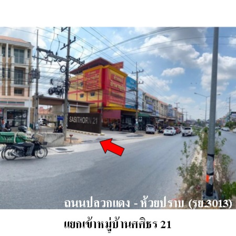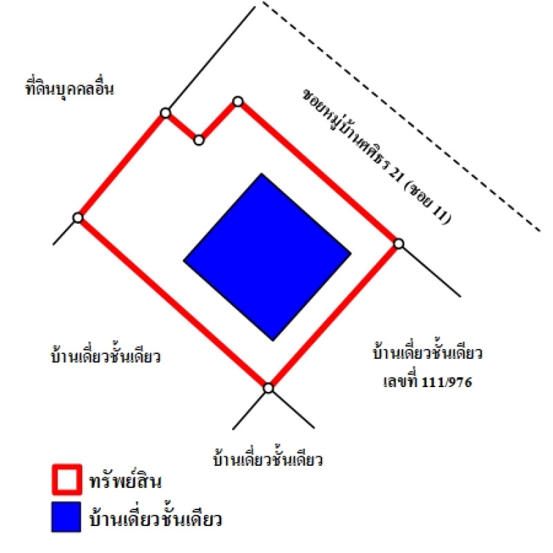 ที่ดินเป็นรูปหลายเหลี่ยม ขนาดแปลงที่ดินด้านทิศตะวันออกติดถนน กว้างประมาณ 21.5 ม. ลึกสุดประมาณ 16.5 ม.บสส. รับโอนกรรมสิทธิ์สิ่งปลูกสร้างระบุเป็นบ้านพักอาศัยตึกชั้นเดียว เลขที่ 111/975, โรงจอดรถ ไม่มีเลขที่ (หลังริม)ถนนผ่านหน้าทรัพย์สิน ได้แก่ ซอยหมู่บ้านศศิธร 21 ซอย 11 เป็นทางในโครงการจัดสรรที่ได้รับอนุญาตแล้ว ผิวจราจรคอนกรีต กว้างประมาณ 6 ม. เขตทางกว้างประมาณ 8 ม.