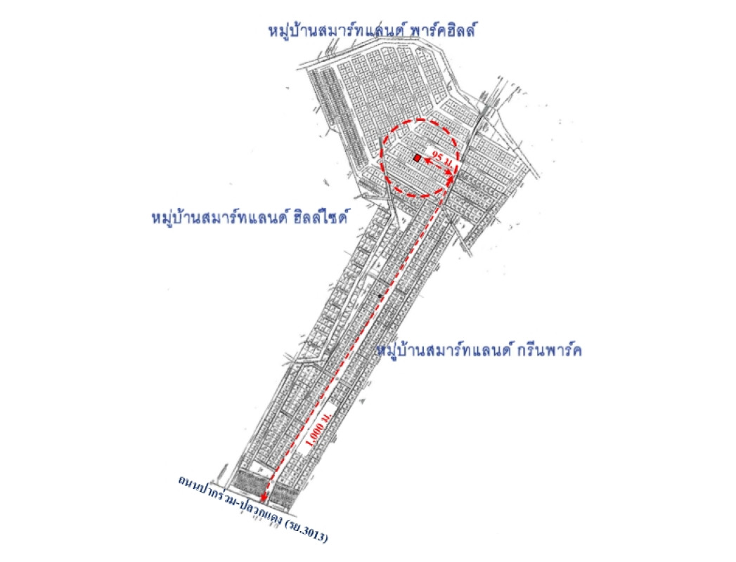 ที่ดินเป็นรูปสี่เหลี่ยมผืนผ้า ขนาดแปลงที่ดินด้านทิศตะวันออกติดถนน กว้างประมาณ 13.5 ม. ลึกประมาณ 16 ม.บสส. รับโอนกรรมสิทธิสิ่งปลูกสร้างระบุเป็นบ้านพักอาศัยตึกชั้นเดียว เลขที่ 88/970, โรงจอดรถถนนผ่านหน้าทรัพย์สิน ได้แก่ ถนนโครงการสมาร์ทแลนด์ พาร์คฮิลล์ ซอย 9 เป็นทางในโครงการจัดสรรที่ได้รับอนุญาตแล้ว ผิวจราจรคอนกรีต กว้างประมาณ 6 ม. เขตทางกว้างประมาณ 8 ม.
