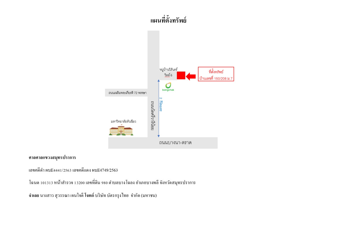 ศูนย์ข้อมูลฯ ได้ทำการตรวจสอบตำแหน่งที่ตั้งทรัพย์บนแผนที่ที่ปรากฎอยู่บนเว็บไซต์ โดยอาศัยข้อมูลจากแหล่งข้อมูลต่างๆ ที่เชื่อถือได้ เพื่อให้ตำแหน่งทรัพย์บนแผนที่ ใช้อ้างอิงท่านไปยังที่ตั้งของทรัพย์นั้นๆ โดยประมาณ ทั้งนี้ศูนย์ข้อมูลฯ ไม่สามารถยืนยันความถูกต้องของตำแหน่งทรัพย์ได้ ดังนั้น ทางศูนย์ข้อมูลฯ ขอสงวนสิทธิ์ไม่รับผิดชอบต่อข้อผิดพลาดทางตำแหน่งทรัพย์ที่เกิดขึ้นบนแผนที่ ผู้นำข้อมูลไปใช้พึงใช้วิจารณญาณและตรวจสอบตามความเหมาะสม