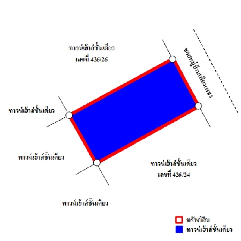 ที่ดินเป็นรูปสี่เหลี่ยมผืนผ้า ขนาดแปลงที่ดินด้านทิศตะวันออกติดถนน กว้างประมาณ 6 ม. ลึกประมาณ 13.7 ม.บสส. รับโอนกรรมสิทธิ์สิ่งปลูกสร้างระบุเป็นทาวเฮ้าส์ชั้นเดียว เลขที่ 426/25ถนนผ่านหน้าทรัพย์สิน ได้แก่ ซอยหมู่บ้านเพียงเพชร เป็นทางในโครงการจัดสรรที่ได้รับอนุญาตแล้ว ผิวจราจรคอนกรีต กว้างประมาณ 6 ม. เขตทางกว้างประมาณ 8 ม.